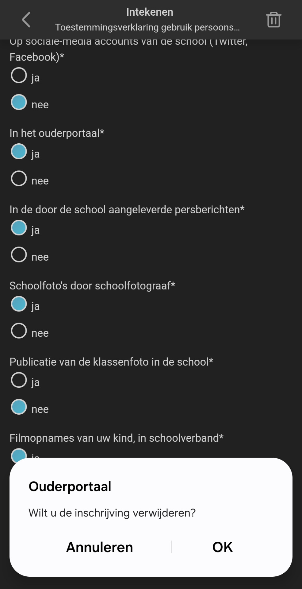 De inschrijving wordt uit het Ouderportaal verwijderd: