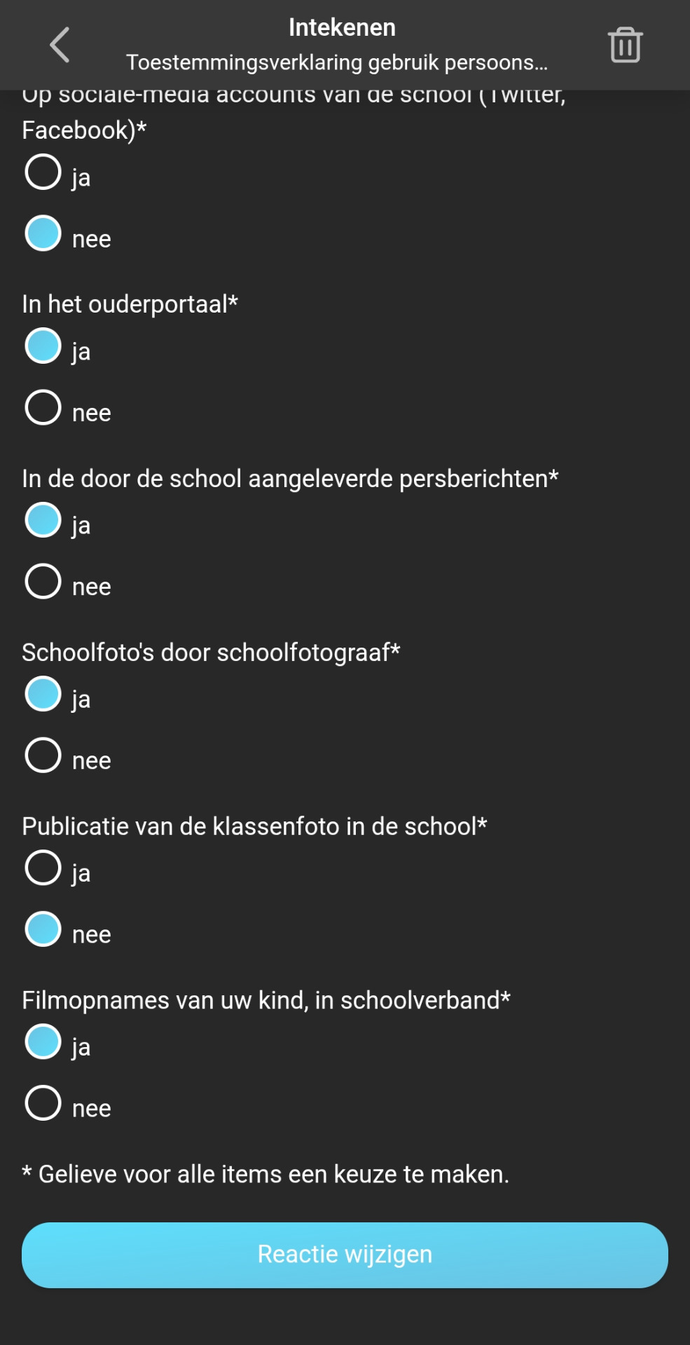 Je komt dan bij het onderdeel 'Toestemming gebruik leerlinggegevens door school' terecht: