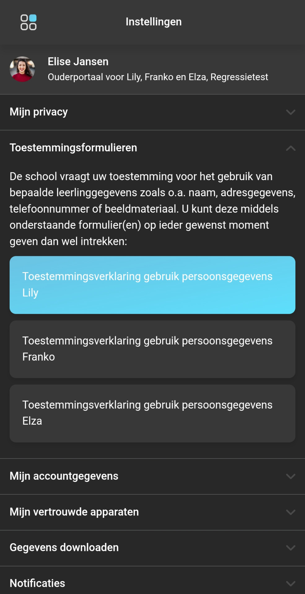 'Instellingen' van de App.Stap 3: Vervolgens kan je onder het kopje 'Toestemmingsformulieren' de toestemmingsformulieren vinden, door dit onderdeel open te klappen: