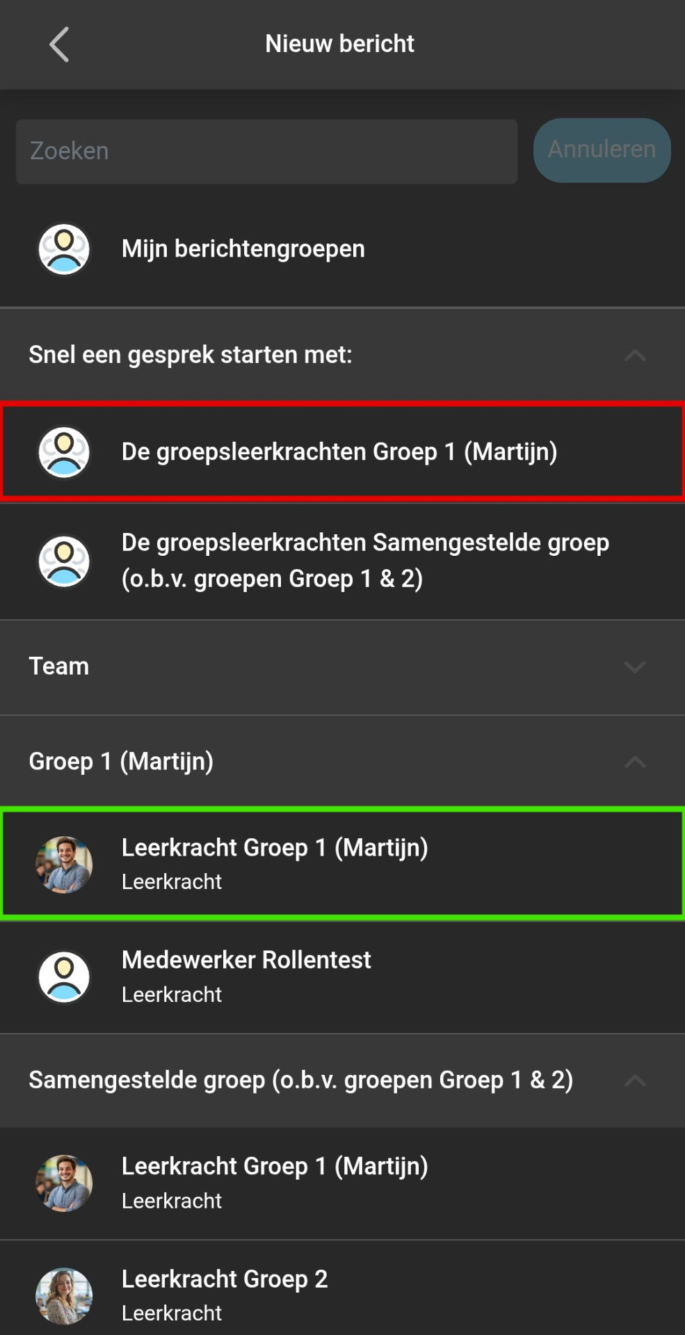 Stap 3: Klik vervolgens bij 'Snel een gesprek starten met:' op de groepsnaam van je klas (als rood aangeduid in de screenshot), om een bericht naar alle leerkracht(en) van de klas te sturen.