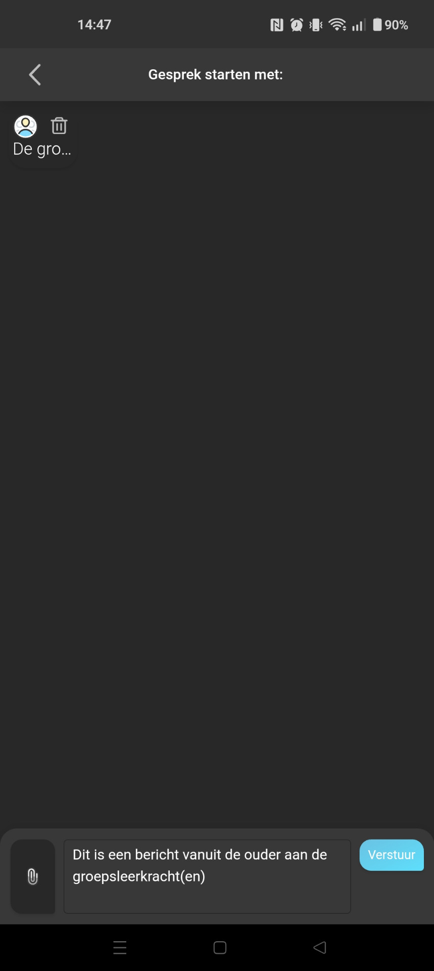 prullenbak icoontje kun je geselecteerde gebruikers verwijderen.Stap 5: Het gesprek laat tenslotte het verstuurde bericht zien. Nu is het wachten op reactie vanuit de groepsleerkracht(en):