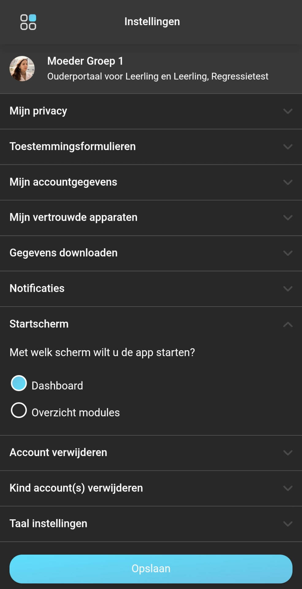 Je kunt instellen dat de app standaard opent op het Dashboard of direct bij het overzicht van de modules.