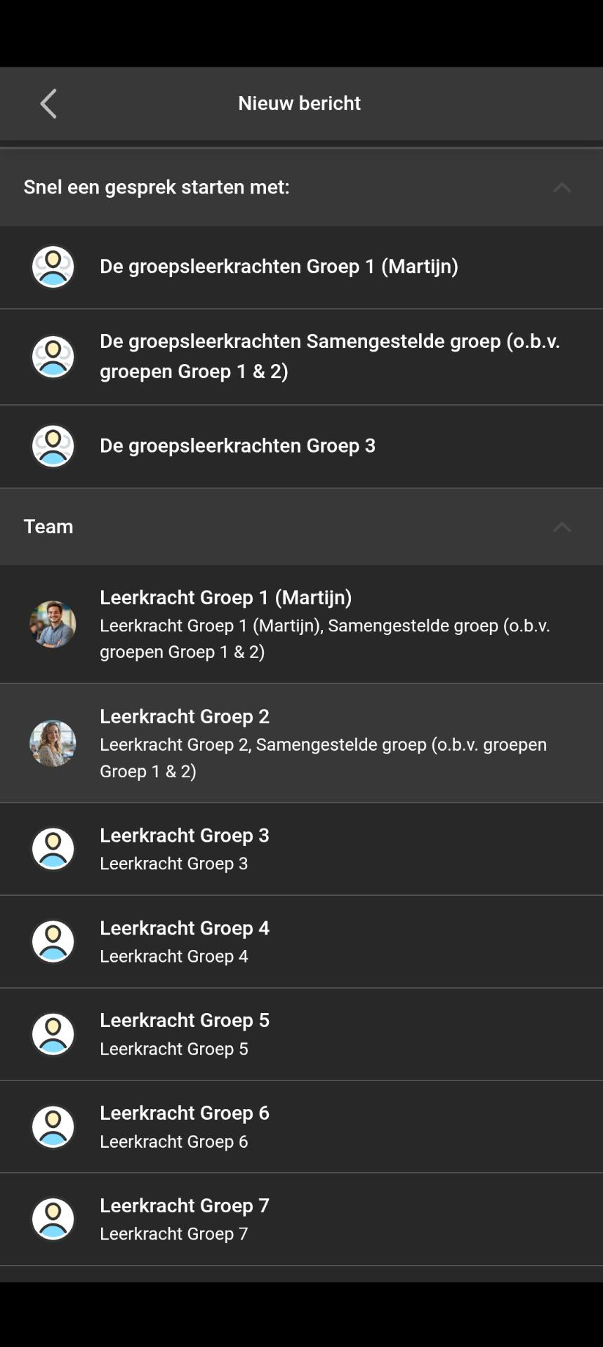 Je krijgt een lijst van de teamleden te zien die voor jou te benaderen zijn: